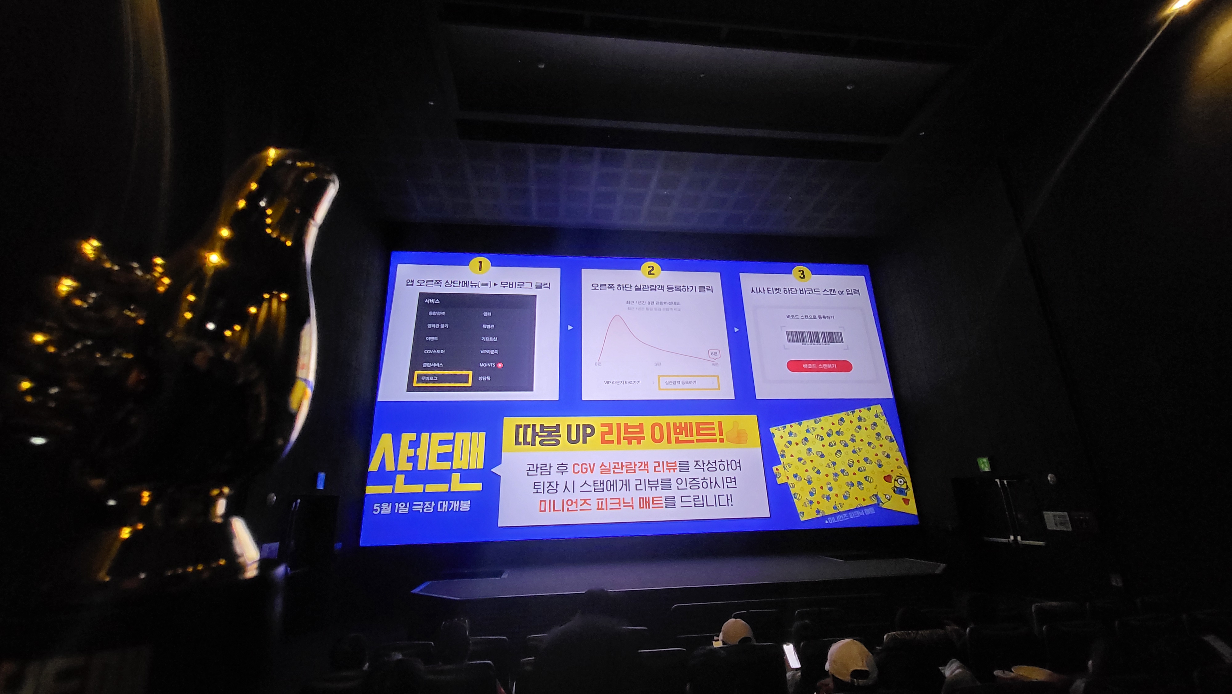 영화가 7시 반에서 7시 50분으로 변경되었네요. 당첨 문자에 먼저 이런 일이 벌어질 수 있다는 것을 예고했으니 이해할 수 있습니다. 라이언 고슬링이나 에밀리 블런트가 왔었으면 좋았겠다 싶은 마음이 간절한 한산함이네요.