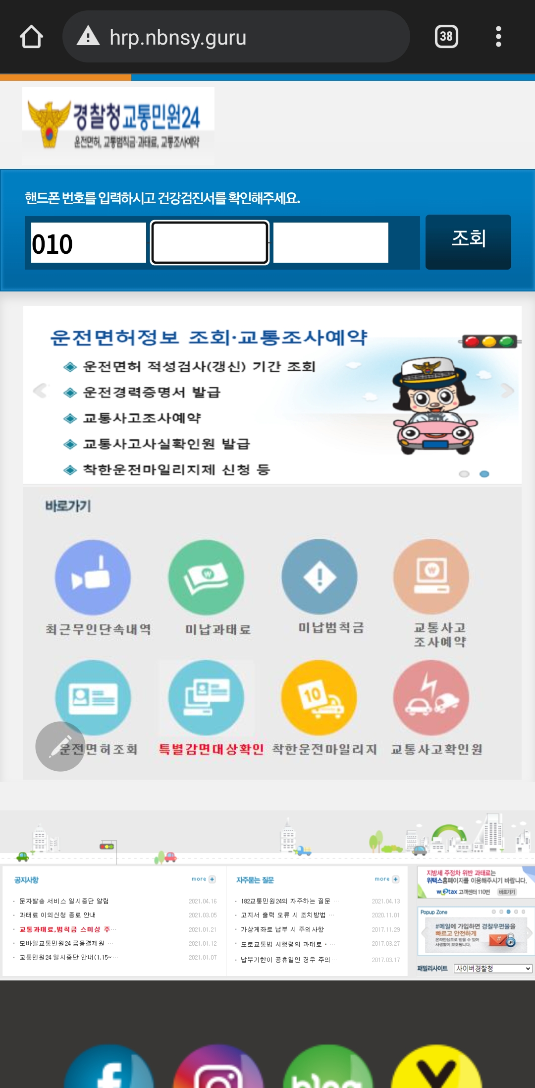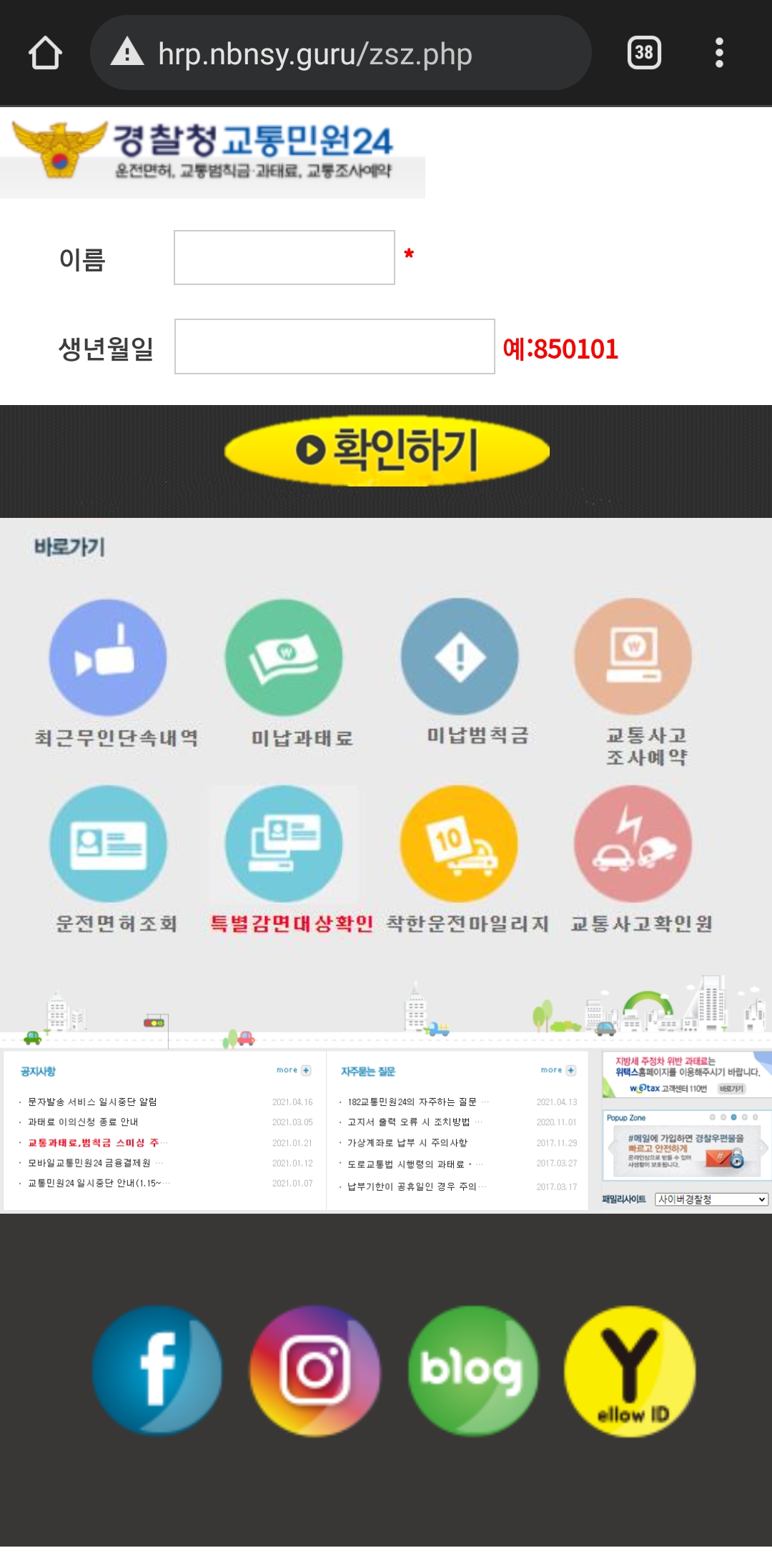 경찰청교통민원24 웹사이트를 사칭한 피싱 사례이다