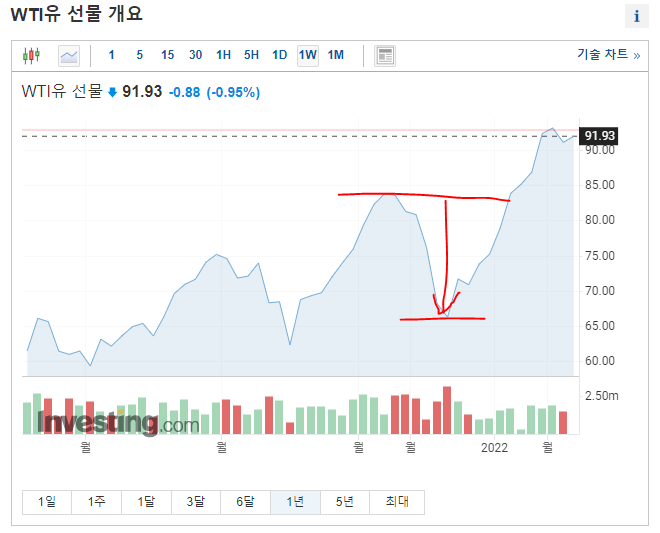 예를 들어 유가가 폭등하여 최고점에 도달하여
