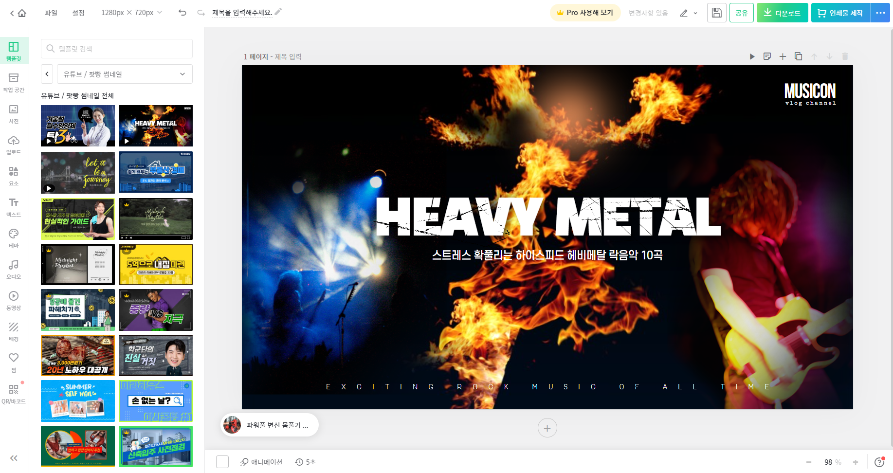 여러분들 썸네일은 어떻게 만드시나요? 포토샵 PPT 포토스케이프 그리고 편집 프로그램 내에서 직접 만들 수도 있고, 디자인 감각이 부족한 초보라면 미리캔버스 사이트에서 만들어 보는 것을 추천드립니다. 다양한 컨셉으로 디자인된 썸네일들을 사용하실 수 있습니다. 이 모든 썸네일을 다 무료로 사용하실 수 있어요. 제작된 썸네일 디자인을 수정하실 수도 있습니다. 지우실 부분은 지우고 필요한 부분은 추가하시면 금방 멋진 썸네일을 만들 수 있습니다. 그리고 이미지를 넣으시려면 가지고 있는 이미지를 넣어주시면 됩니다. 완료된 이후에는 파일로 다운로드가 됩니다. 썸네일뿐만 아니라 여기서 채널 아트 같은 경우도 쉽게 만들 수 있어요. 템플릿에 가셔서 내 채널 아트에 맞게 글자랑 이미지를 수정만 하시면 돼요. 유튜브를 시작하신 초보분들에게는 정말 추천해 드리고 싶은 사이트예요.