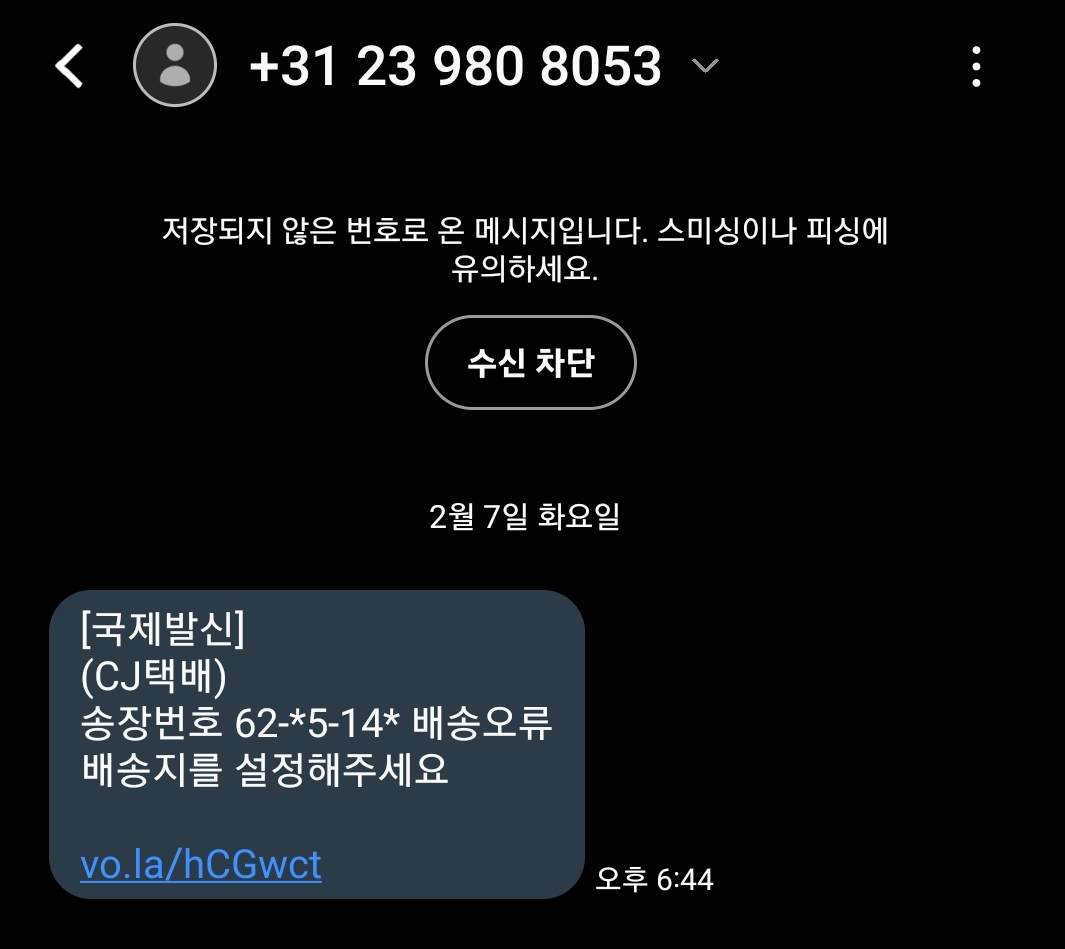 국제발신 CJ 택배 배송오류 배송지 설정 스미싱 피싱 스팸 낚시 문자 조심하세요게시글 2023. 2. 15. 21:58반응형