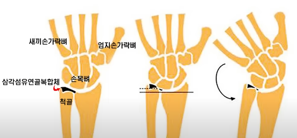 이렇게 되면 손목이 뒤로 기울면서 거기에 더해 바깥쪽으로 뻗히게 되고 이런 운동 습관이 지속되면 척골과 삼각 연골이 서로 어긋난 각도로 꺾이게 되면서 퇴화 혹은 염증이 일어나게 되죠.